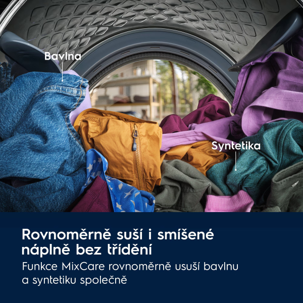 MixCare přináší výkonné, ale šetrné sušení smíšených bavlněných i syntetických materiálů a zaručuje rovnoměrné sušení oblečení bez nutnosti třídění.